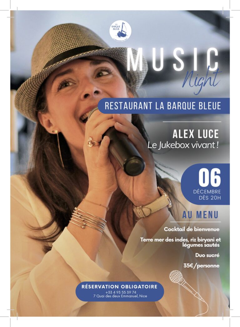 Réservez votre soirée du Vendredi 6 Décembre 2024 ! ALEX LUCE Le Jukebox vivant ! Délicieux menu spécialement concocté pour l’occasion : Cocktail de bienvenue Cassolette de la mer Caliente à l’espagnole avec riz coloré Tiramisu exotique Réservez vite votre table pour ne pas manquer cet événement ! Soirée diner + concert à 35€/pers.